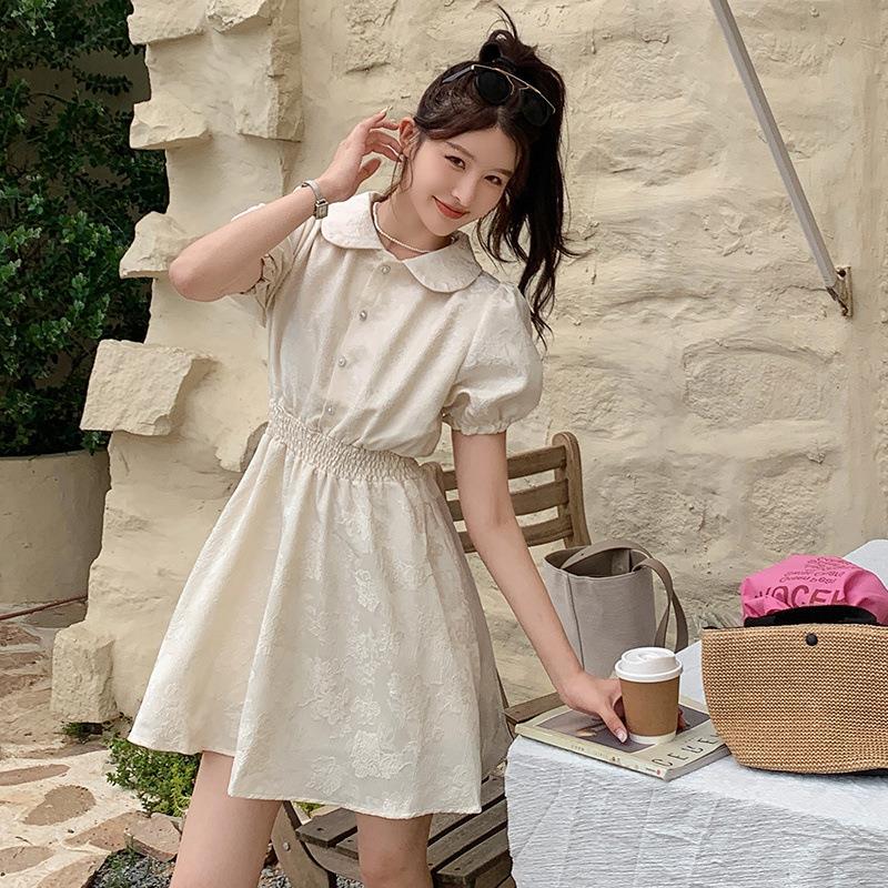 实拍提花刺绣小香风娃娃领别致排扣设计泡泡袖松紧收腰显瘦连衣裙