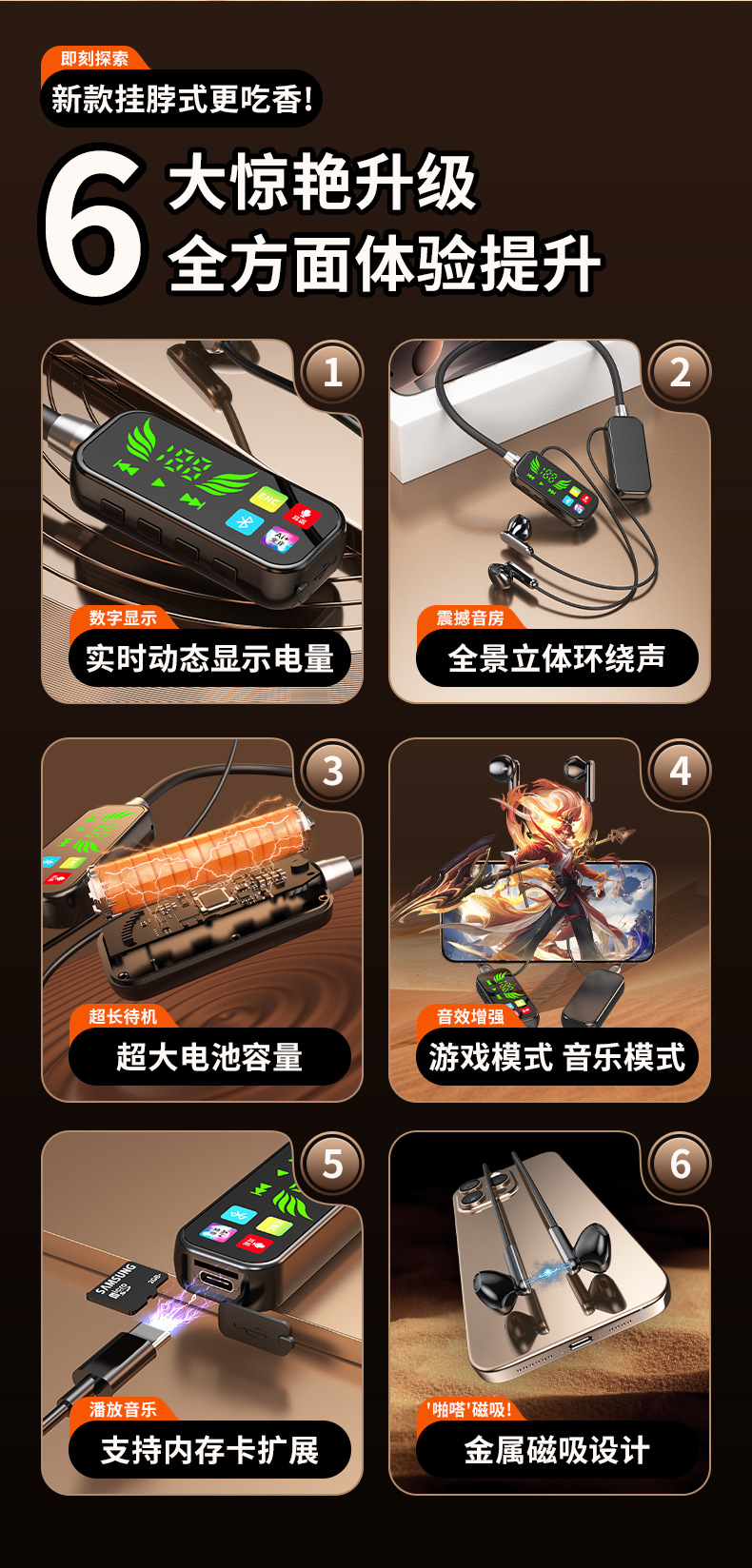 新款挂脖式蓝牙耳机大电量带数显游戏运动颈挂耳机可插卡使用