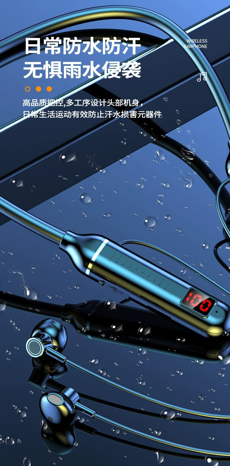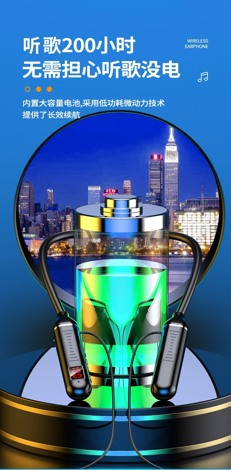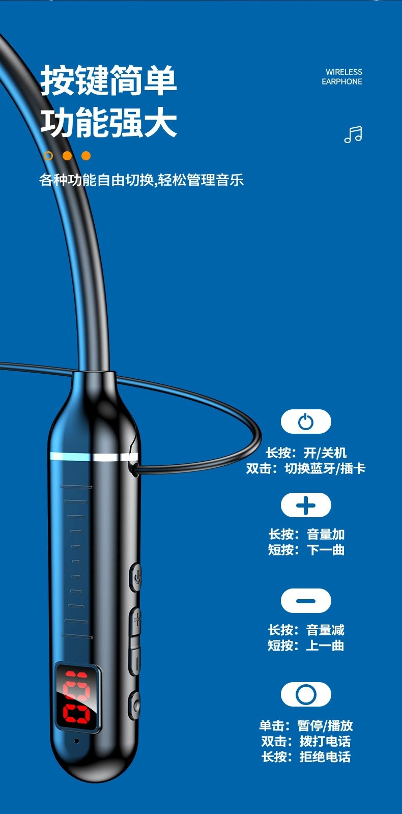 无线蓝牙耳机超长续航待机大电量数显运动挂脖式蓝牙耳机