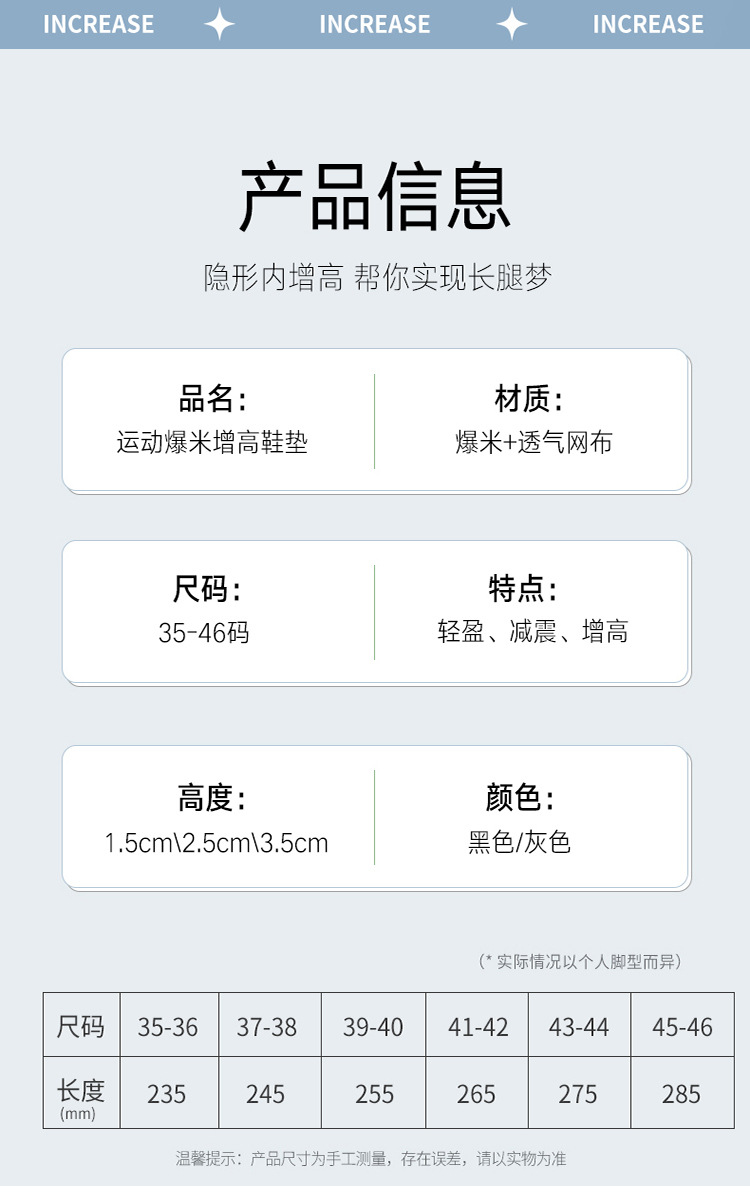 足弓支撑增高鞋垫女不累脚隐形内增高七分增高垫不塌陷半垫爆米花