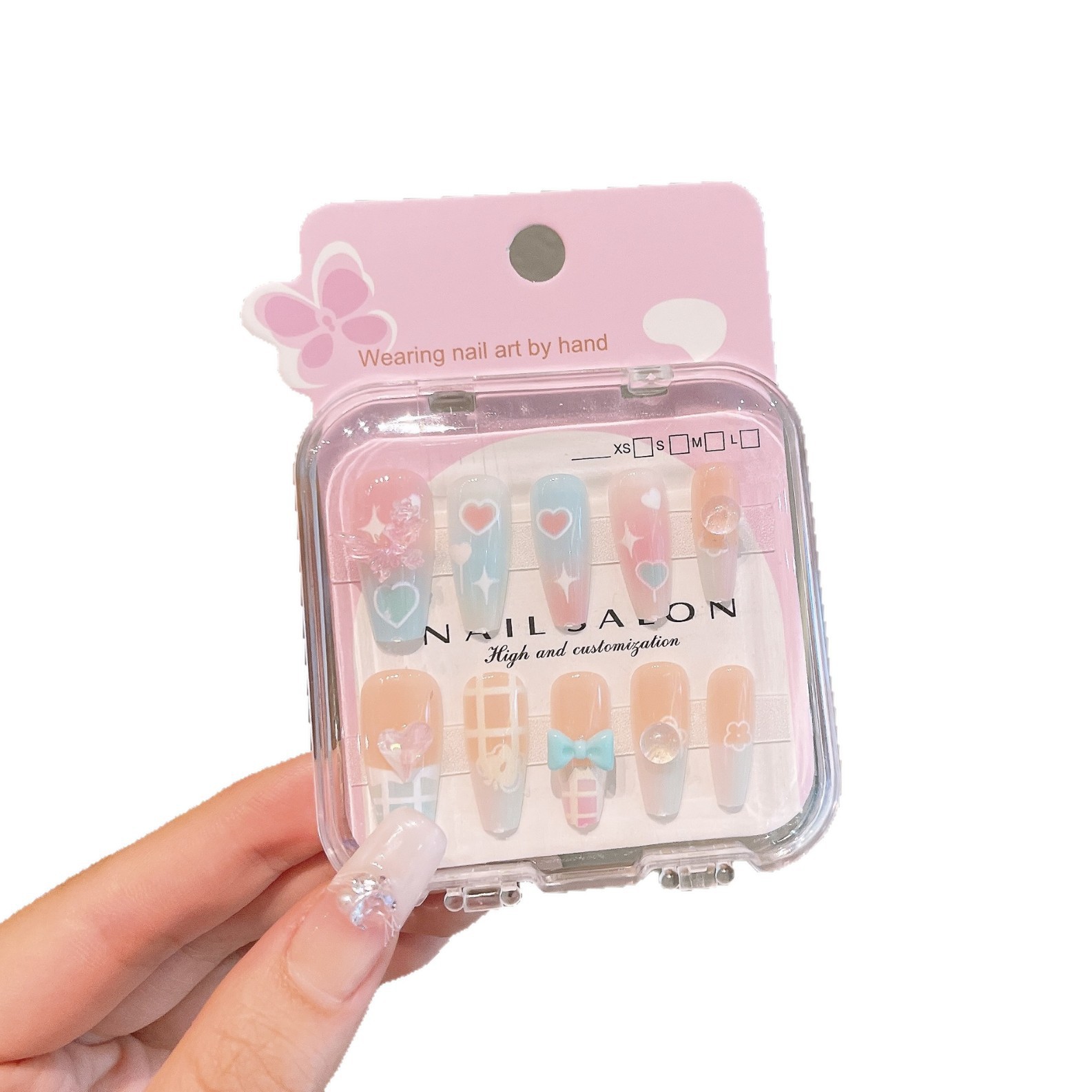 新款卡通儿童穿戴甲长款可爱心形蝴蝶结可拆卸甜美少女美甲指甲贴