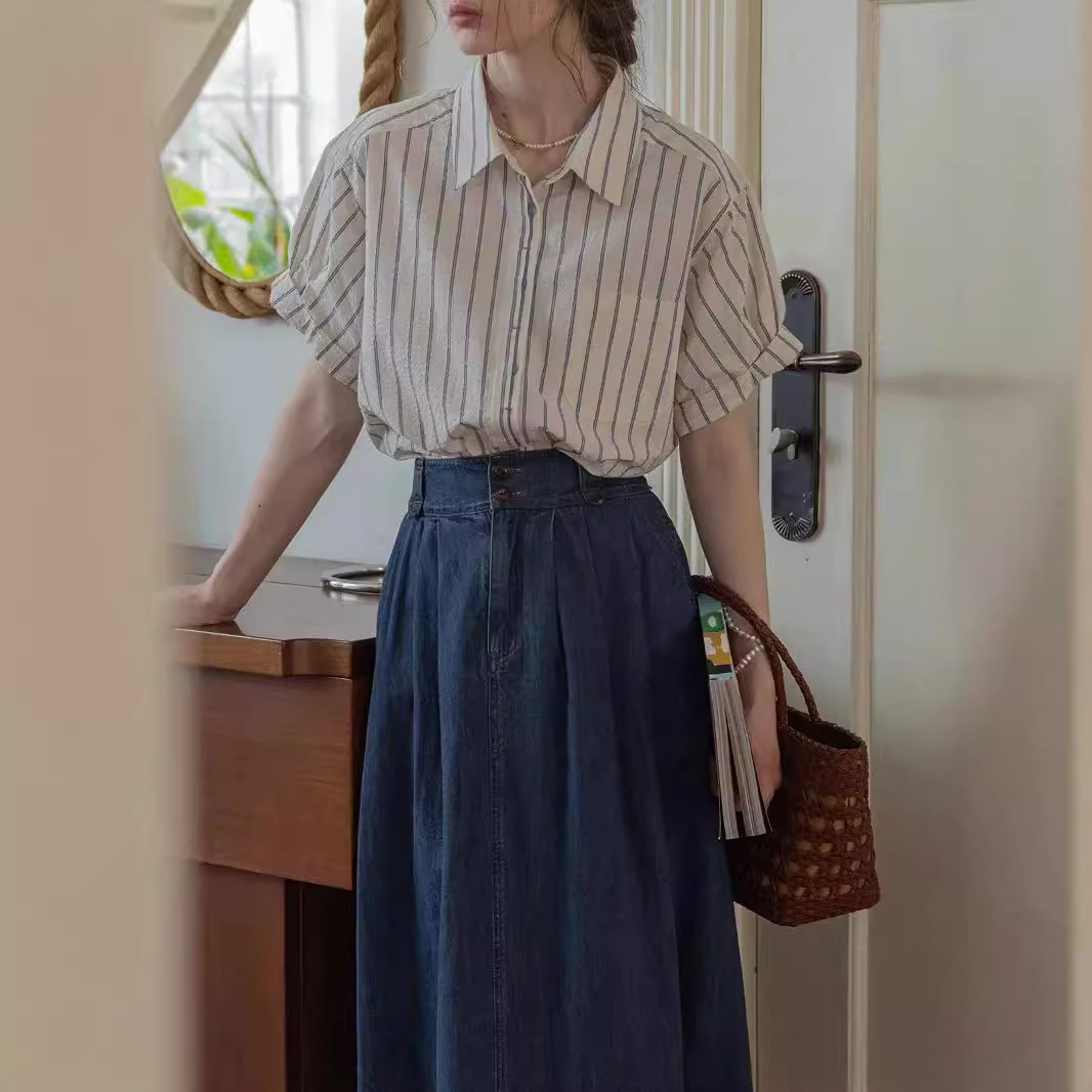 法式条纹衬衫宽松通勤卷袖透气复古纯棉短袖上衣女夏季