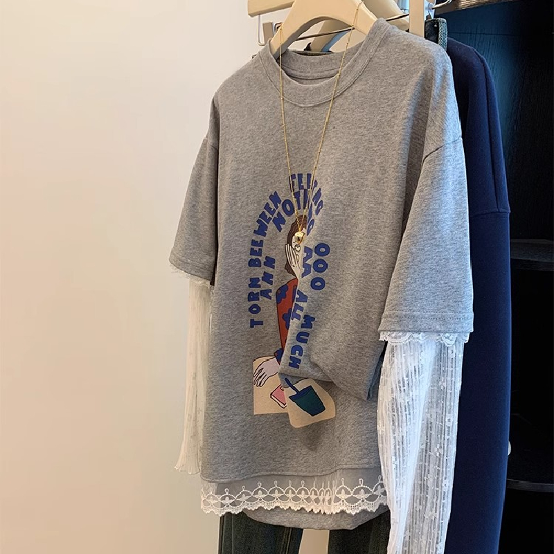 甜系大码蕾丝花边拼接长袖t恤女夏季假两件防晒宽松显瘦上衣打底