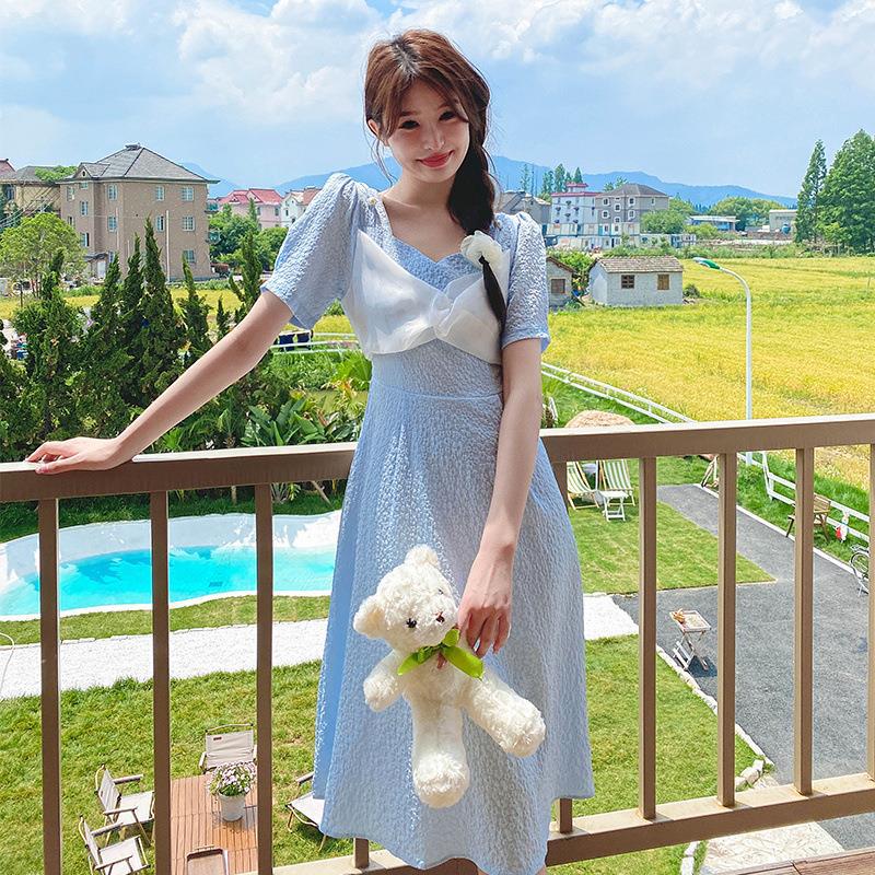 实拍蓝色少女感方领泡泡袖珍珠扣肩带撞色拼接蝴蝶结肌理感连衣裙