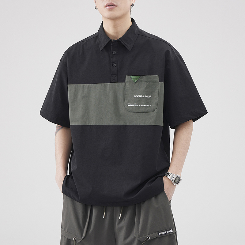 冰丝透气翻领POLO衫男宽松大码时尚拼接夏季百搭速干半袖体恤上衣