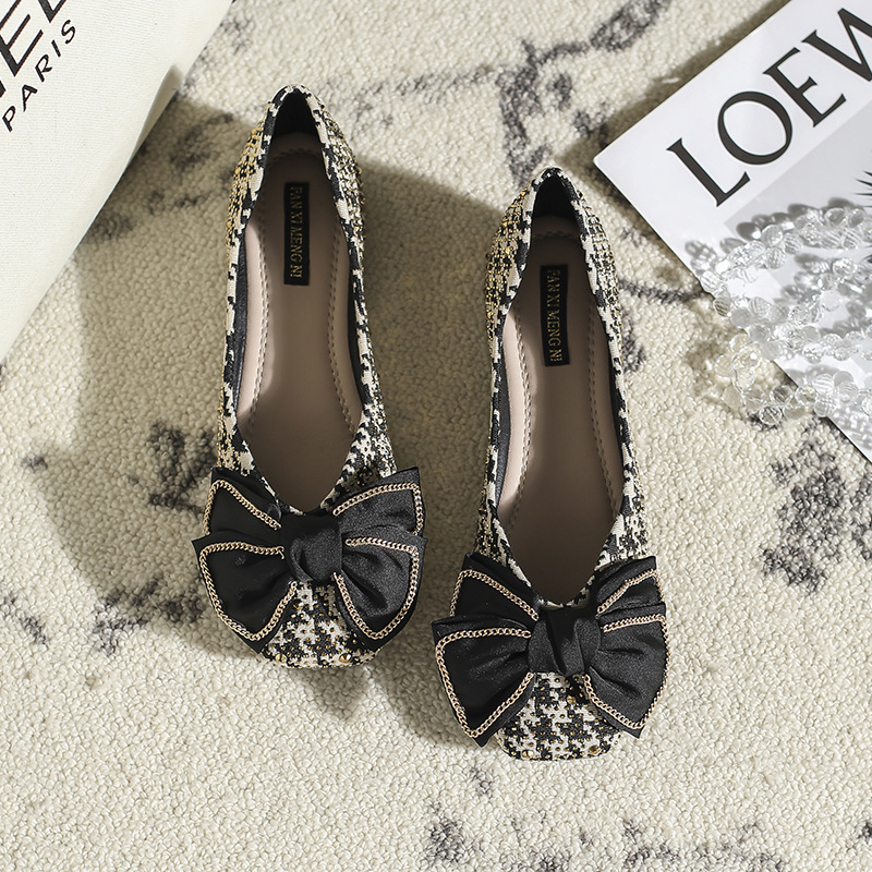 方头单鞋女平底春夏一脚蹬百搭蝴蝶结千鸟格软底浅口绒面豆豆鞋