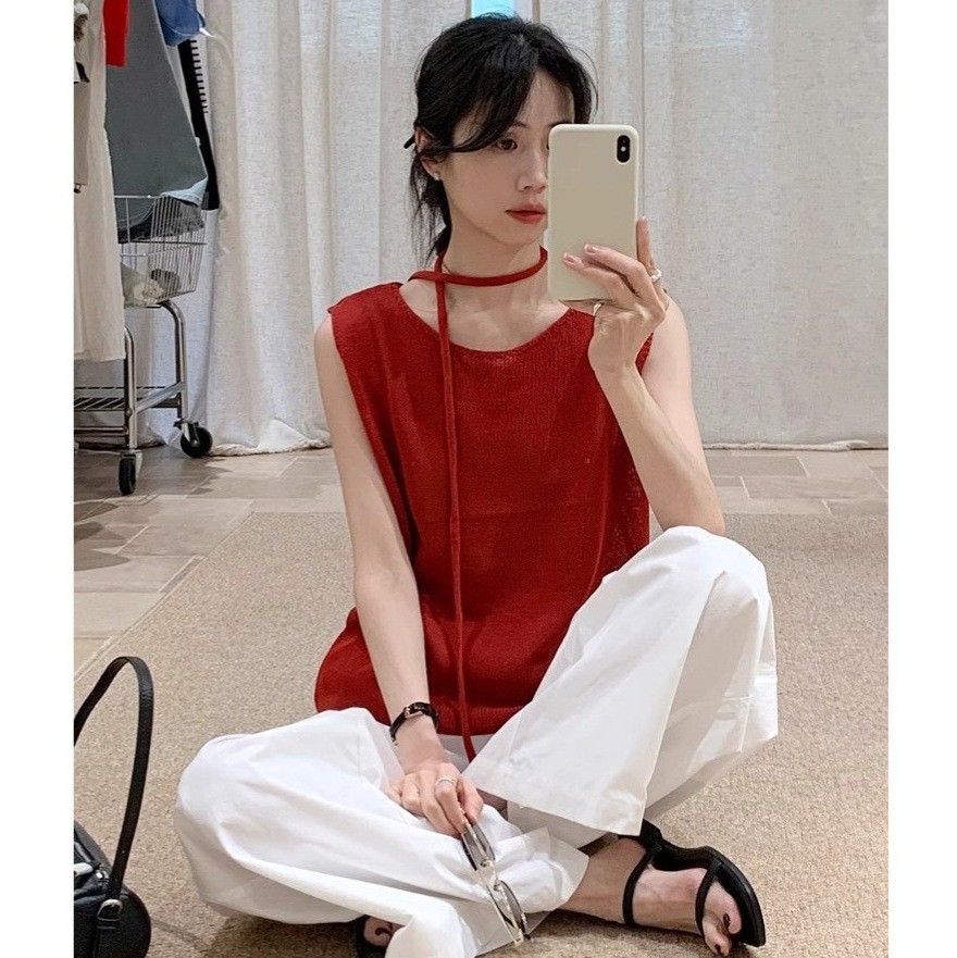 韩系红色简约精致针织背心女2025夏季新款背心收腰坎肩针织T恤