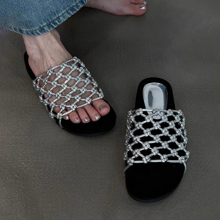 软皮版~手工编织渔网镂空厚底沙滩鞋女百搭休闲圆头露趾凉拖鞋