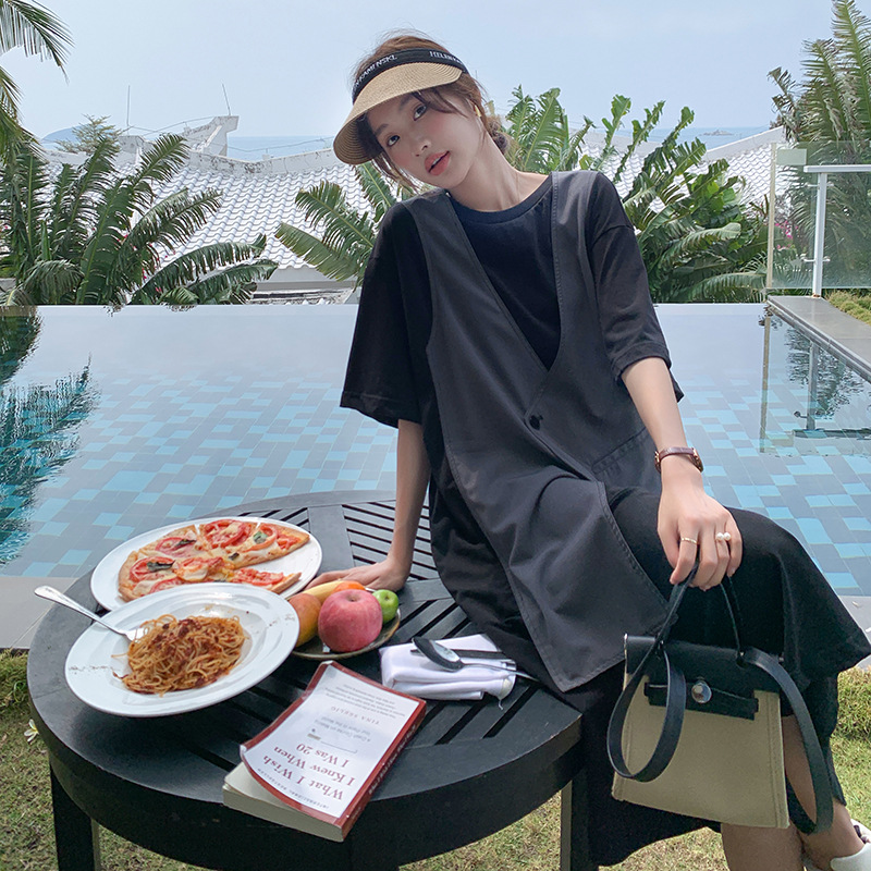 休闲风设计款马甲假两件夏新款连衣裙撞色圆领落肩拼接中长裙