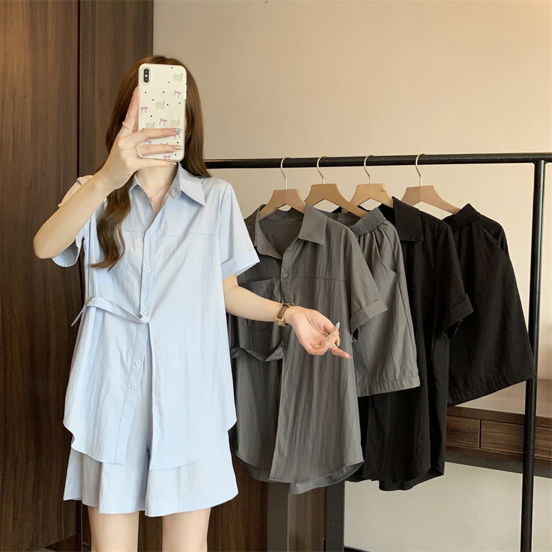 大码女装胖mm夏装新款显瘦纽扣短袖上衣高腰遮胯休闲裤两件套