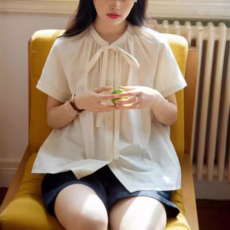 黄色衬衫女夏季新款法式圆领蝴蝶结插肩袖衬衣上衣