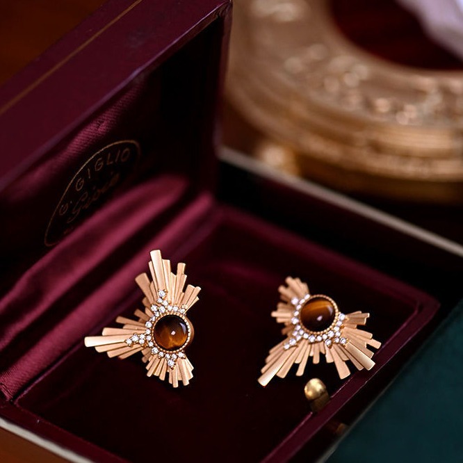 《飞鸟集》法式天然虎眼石耳钉时尚高级感复古耳环轻奢时尚耳饰品