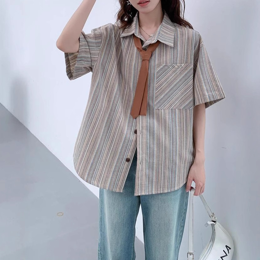 夏日必备~条纹衬衫女休闲宽松领带短袖衬衣潮流时尚高级质感上衣