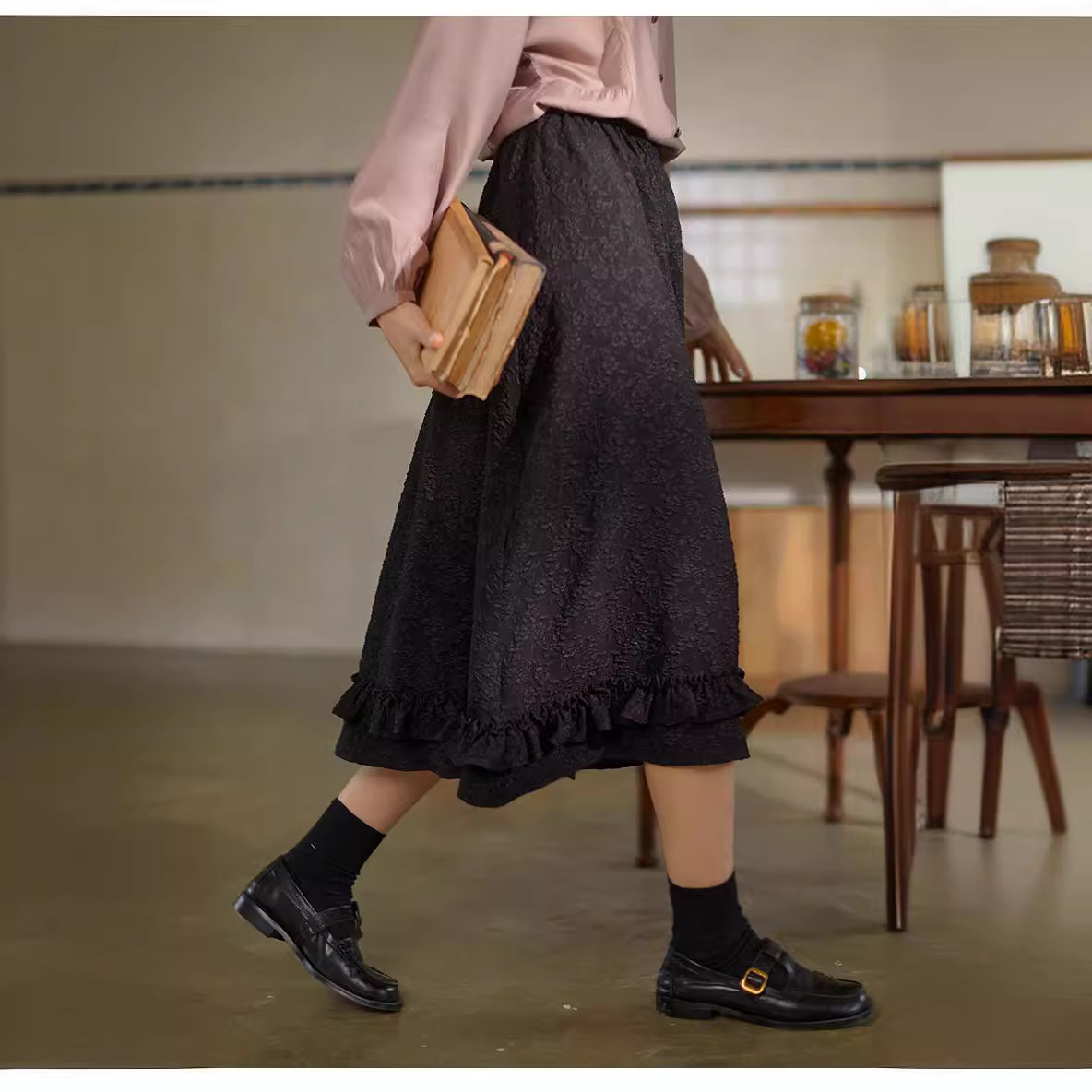 春夏百搭简约肌理花纹宽松型荷叶边纯色半身裙