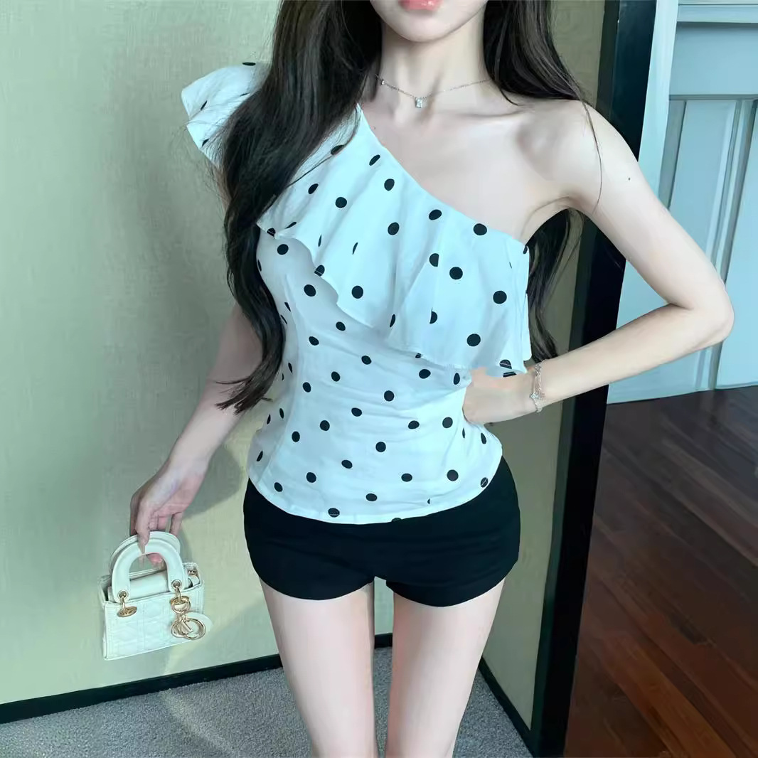 法式荷叶边波点斜肩无袖背心女装夏季修身设计感辣妹chic外穿上衣