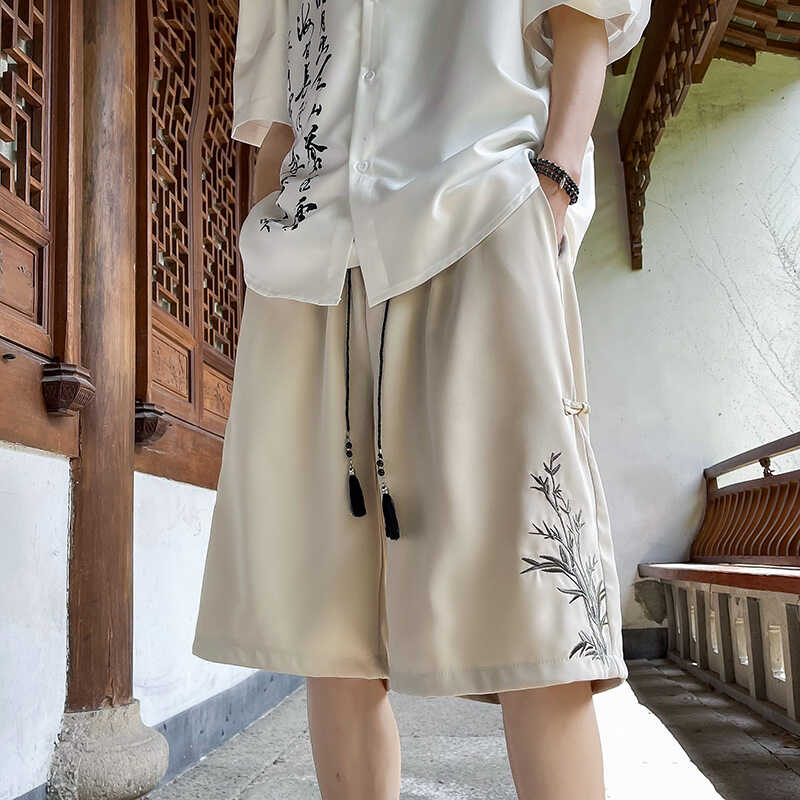 新中式国风竹子刺绣短裤男款夏季ins潮流宽松阔腿直筒垂感五分裤