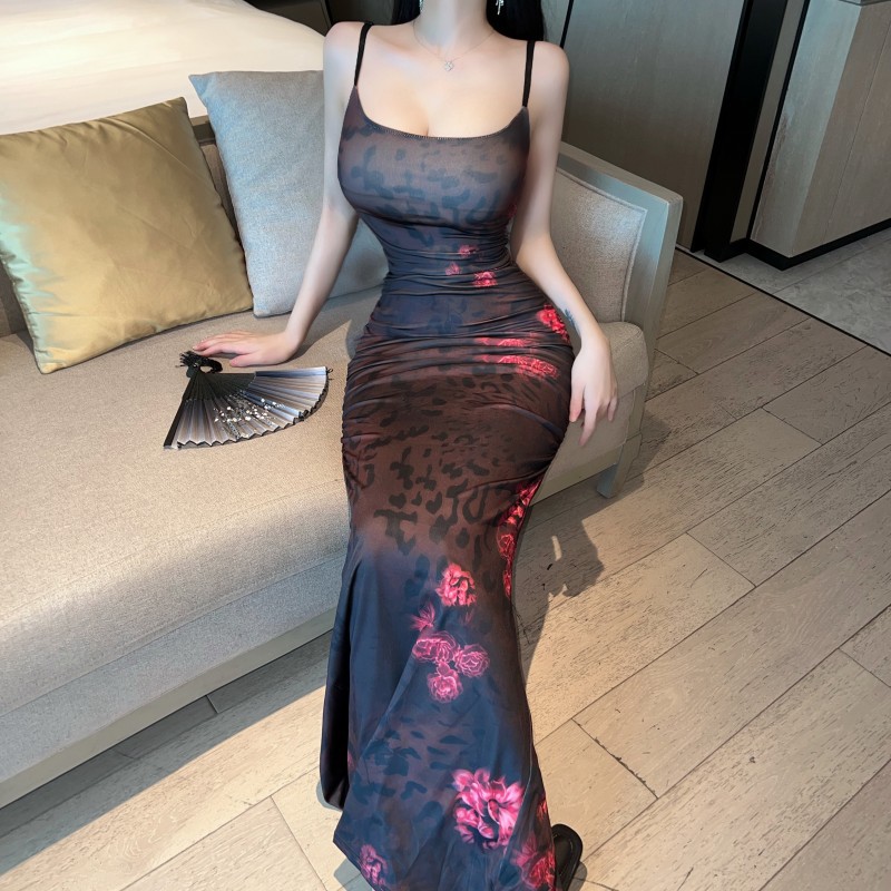 欧美外贸性感风夜店别致印花吊带后开叉长裙礼服紧身包臀连衣裙女