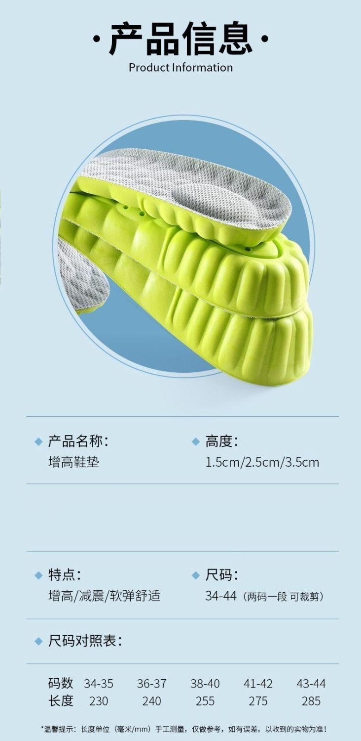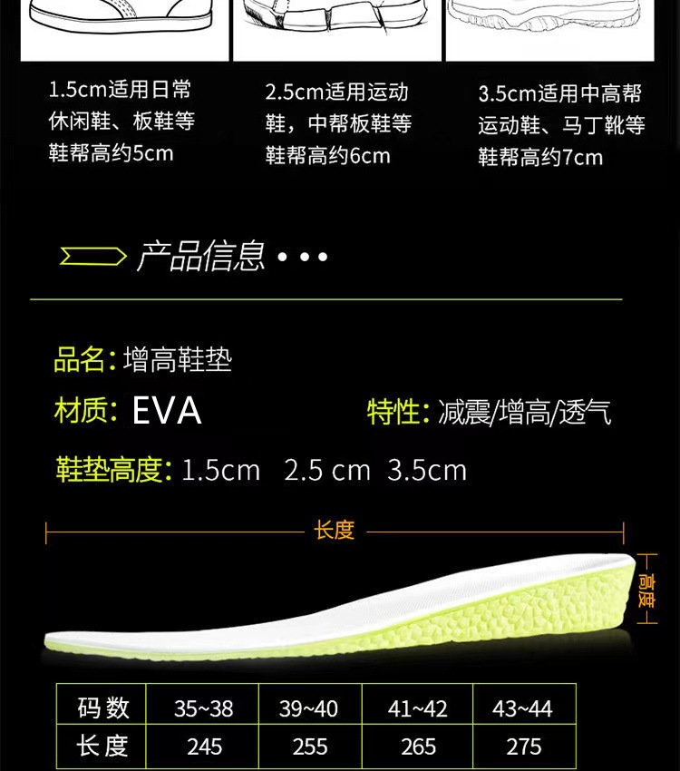 隐形内增高鞋垫凝胶弹性支撑马丁靴皮鞋小个子半垫走路不累脚鞋垫