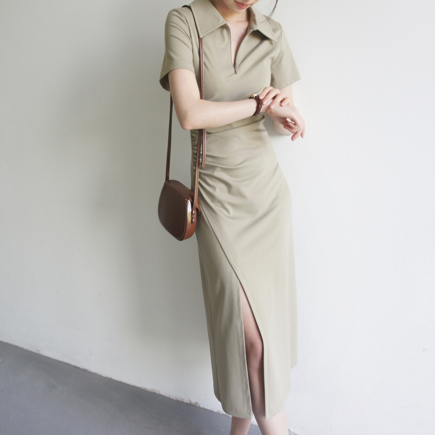 卡其色POLO拉链式翻领褶皱遮肚收腰侧开衩高级感针织连衣裙