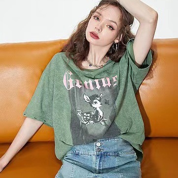 绿色复古印花短袖t恤女夏季新款半袖小众宽松上衣
