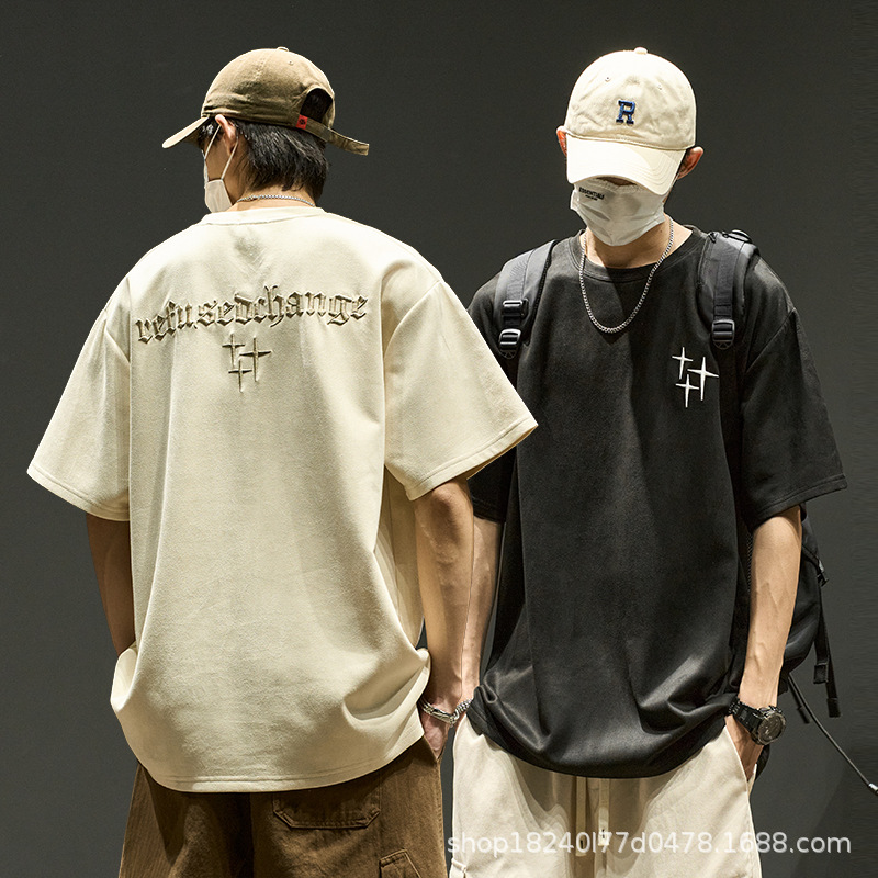 美式复古短袖t恤男美式高街潮牌ins设计感刺绣半截袖夏季宽松休闲