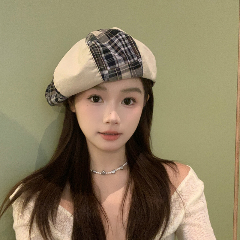日系复古小众贝雷帽子女秋季拼接格子画家帽显脸小大头围云朵帽潮