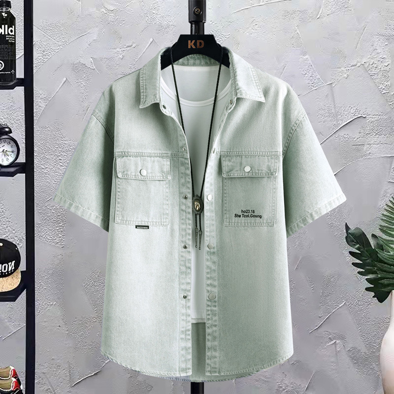 新款短袖牛仔衬衫男生夏季薄款潮流衬衣青少年宽松休闲外套