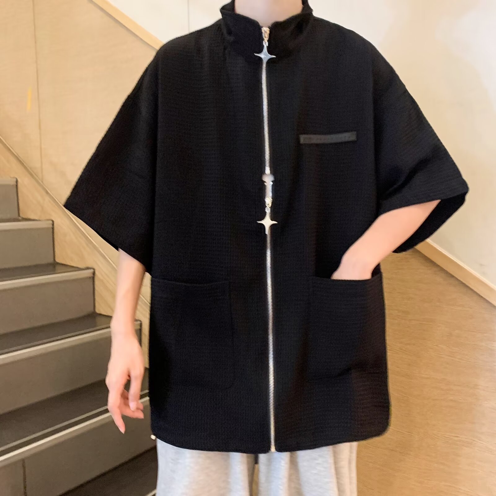 同款华夫格小众设计感双拉链短袖衬衫男夏季休闲百搭立领衬衣