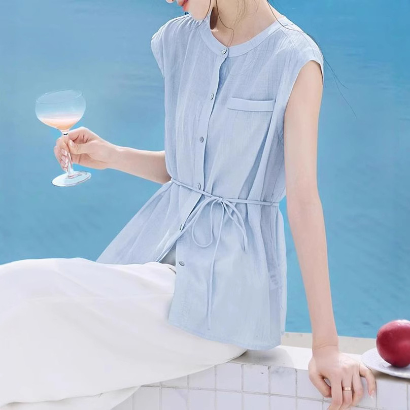 清冷感气质复古立领收腰系带无袖衬衫25夏季新款小衫女
