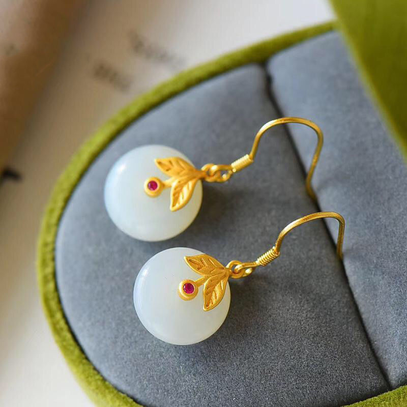 白玉镶嵌古法金沙金鎏金耳环平安扣工艺气质女神古风古典耳饰品