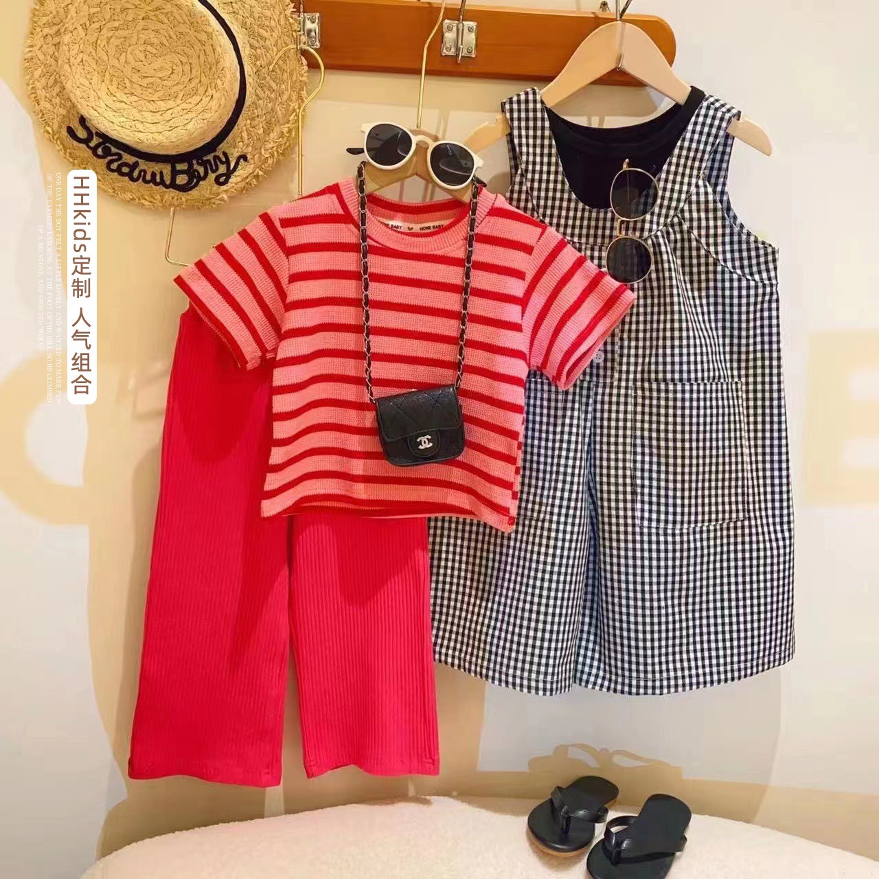 新品女童条纹弹力高弹打衫T恤坑条休闲裤两件套2025夏装套装