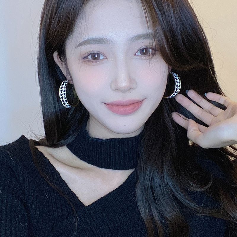 复古百搭千鸟格皮革耳环女欧美新款夸张轻奢高级感耳圈耳饰品