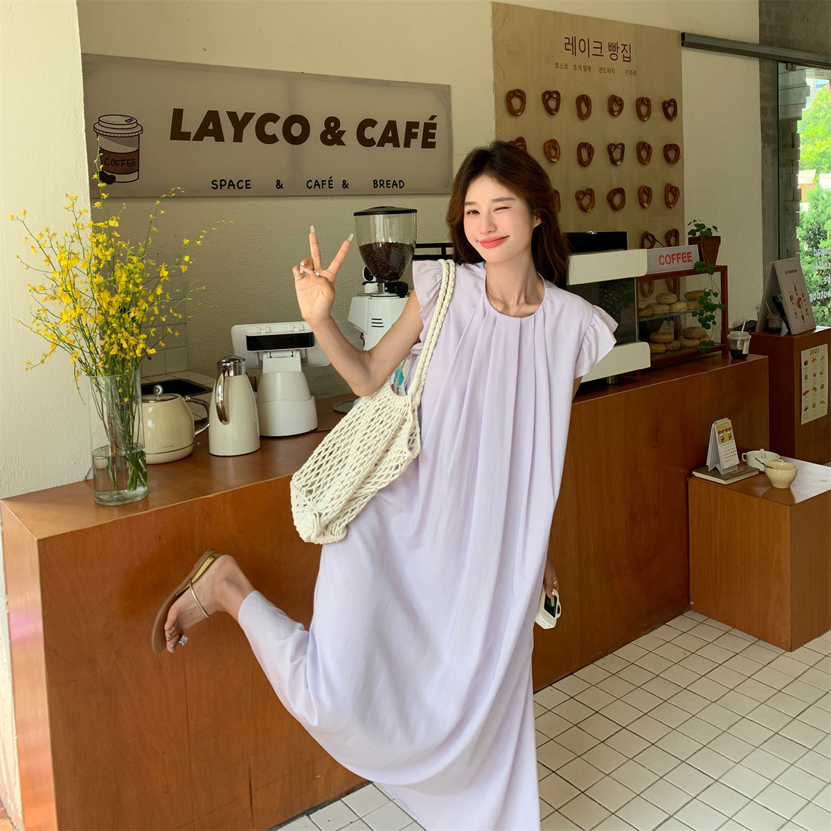 紫色简约褶皱连衣裙女中长款夏新款法式显瘦飞飞袖绝美A字裙
