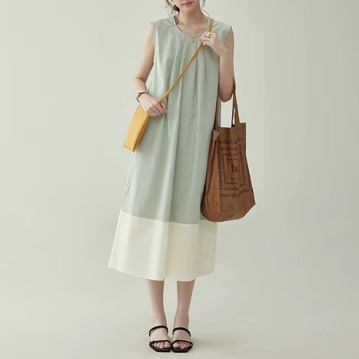 韩系休闲无袖撞色减龄拼接连衣裙女夏季新款宽松压褶简约裙子
