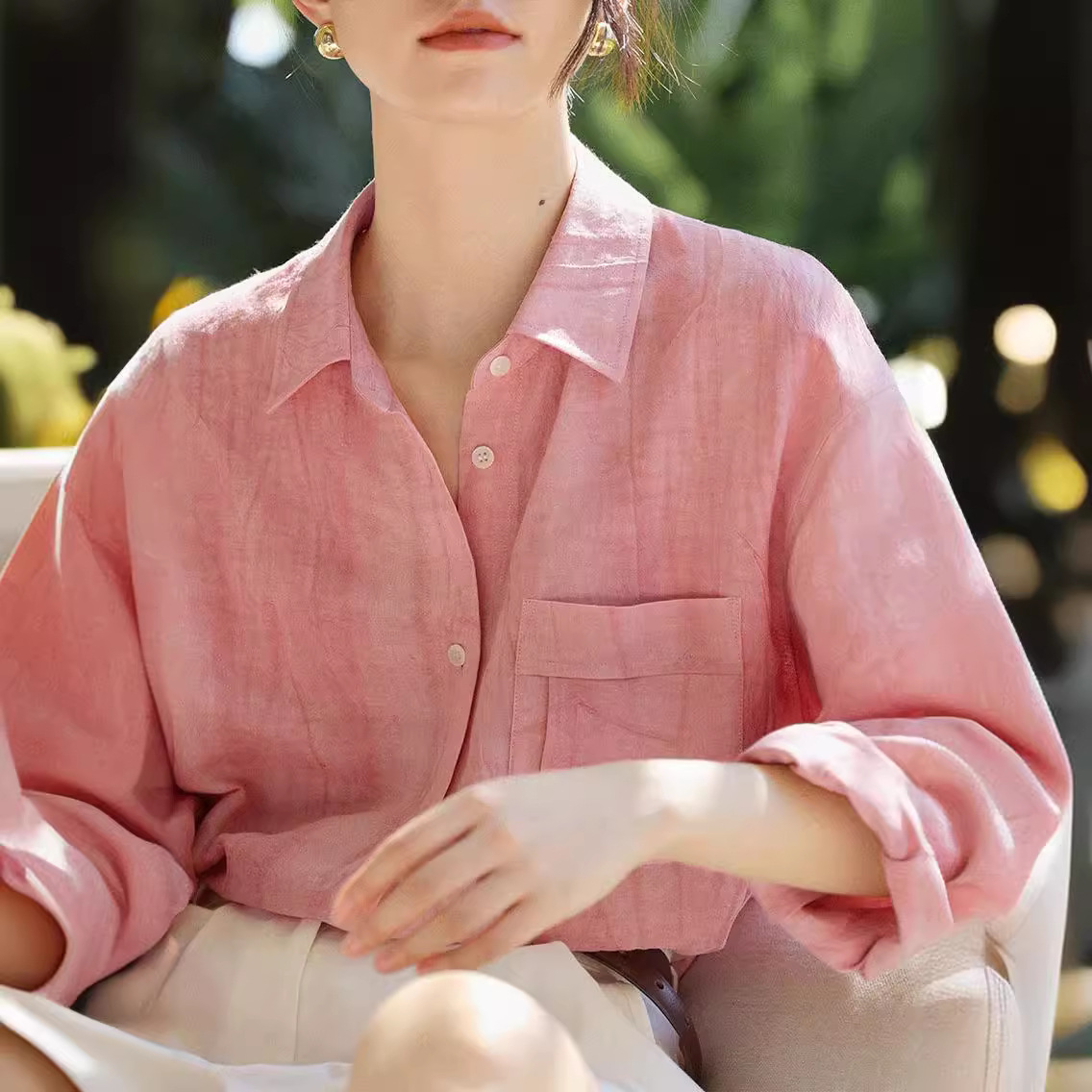 春日来信手工炒色粉色长袖防晒衬衫女春夏显瘦树莓粉上衣
