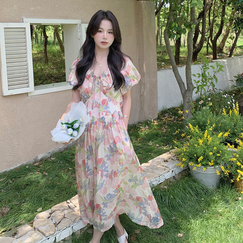 温柔气质泡泡碎花连衣裙新款法式夏季收腰显瘦多巴胺印花长裙