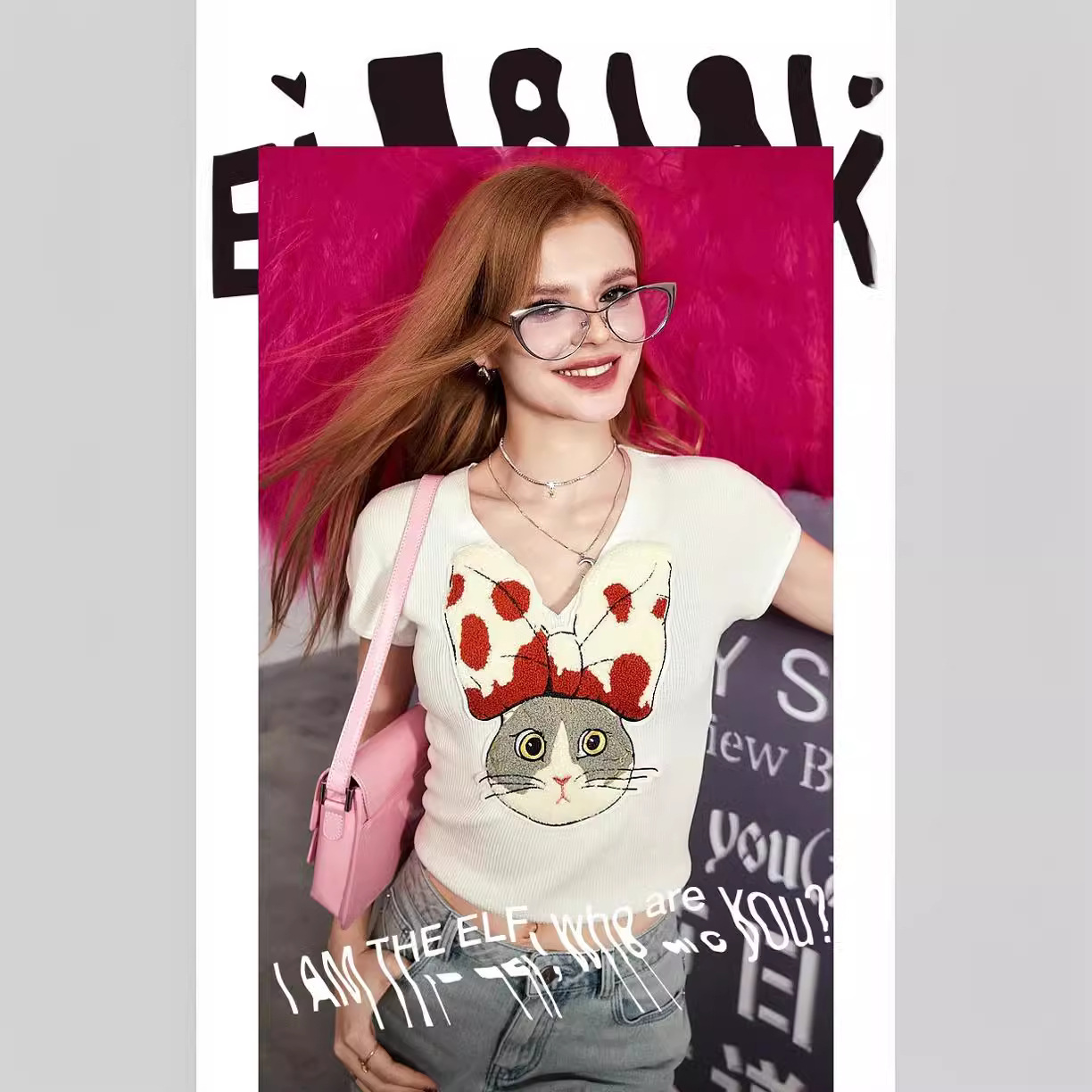 植绒猫咪印花V领针织衫女春季新款小个子短袖上衣