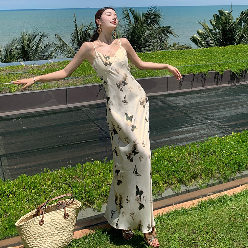 新中式缎面吊带裙子女春季新款国风蝴蝶印花长款连衣裙礼服裙