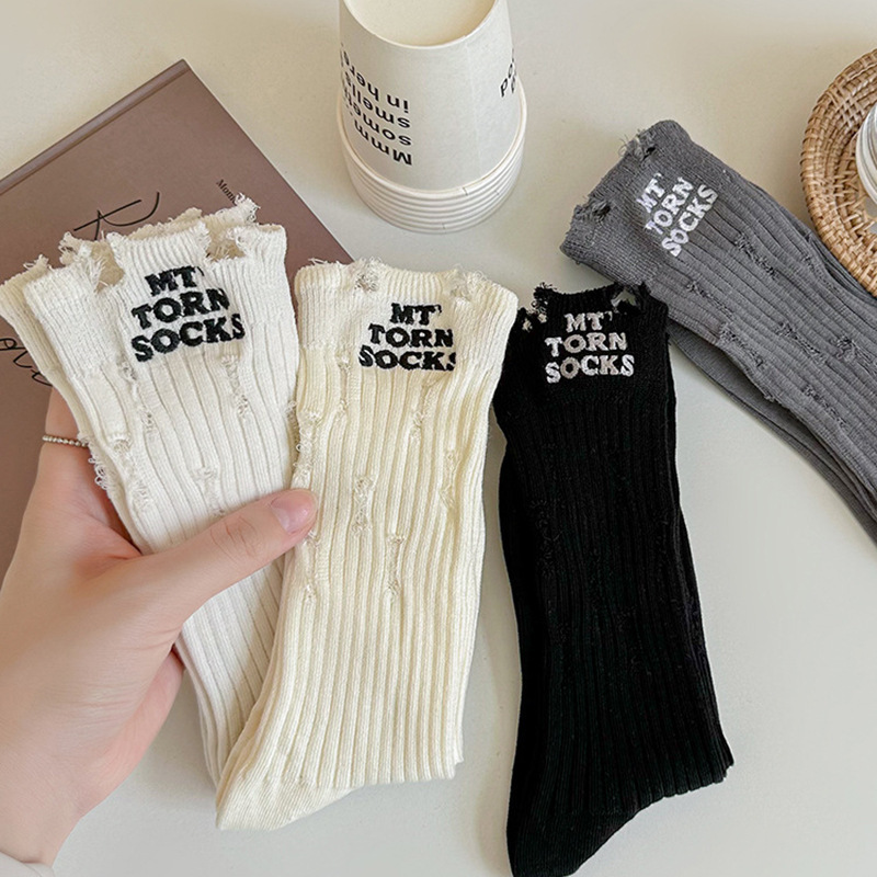 破洞刺绣袜子女ins风街头潮流时尚洞洞袜乞丐袜韩版纯棉中筒袜子