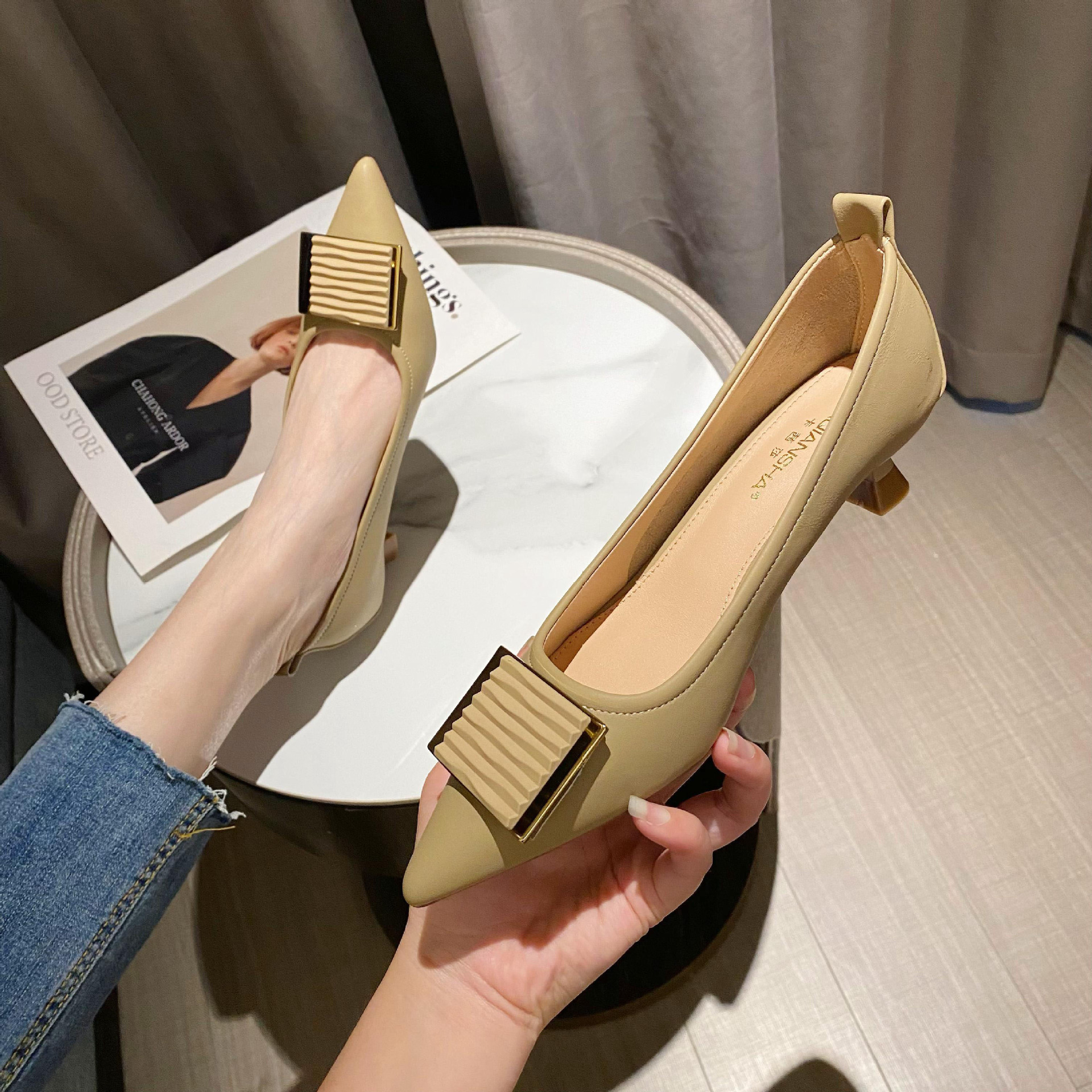 金属方扣软皮时尚高跟鞋夏季新款韩版尖头浅口细跟单鞋女