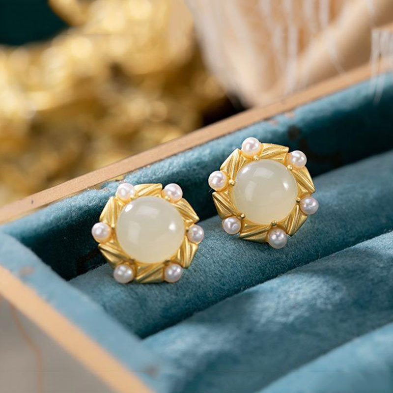 六轮纷飞镶嵌和田白玉耳钉复古宫廷风贝水珍珠镀金925纯银耳钉