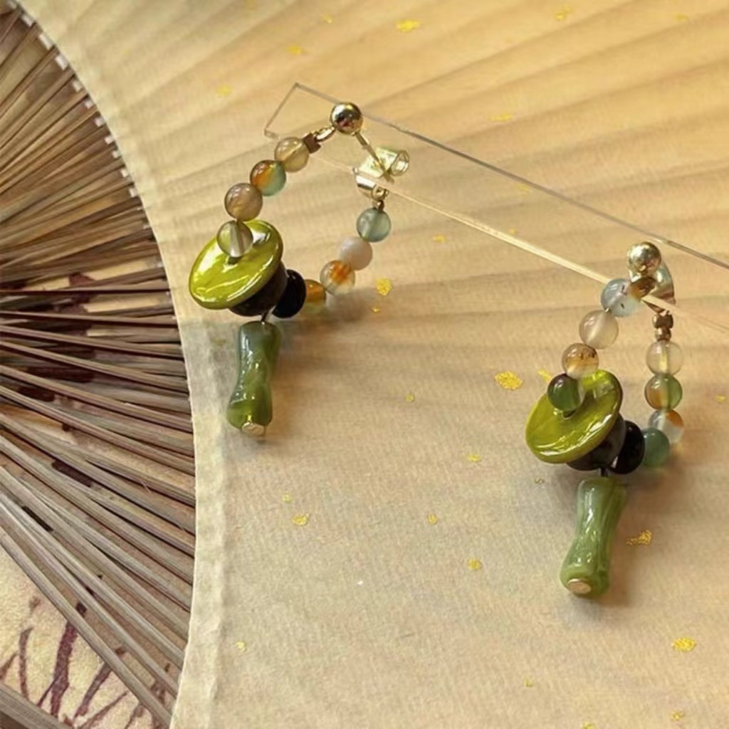 春夏天然石串珠古风竹节撞色耳圈环名族风复古蚊香盘耳夹无耳洞女