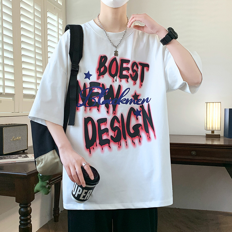美式高街印花短袖t恤男夏季重磅五分半袖男青少年潮牌休闲体恤衫