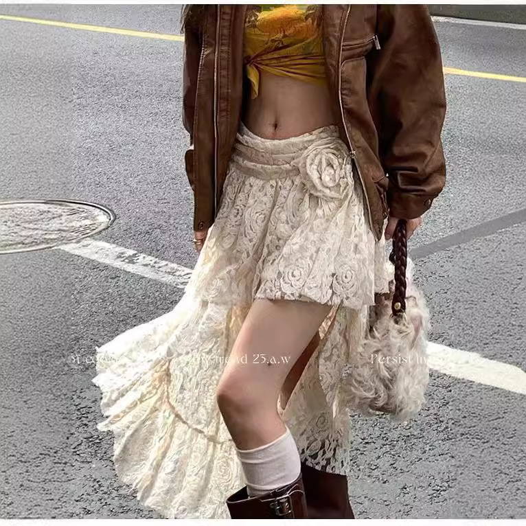 新款蛋糕裙不规则裙摆设计感玫瑰花蕾丝半身裙甜美A字裙