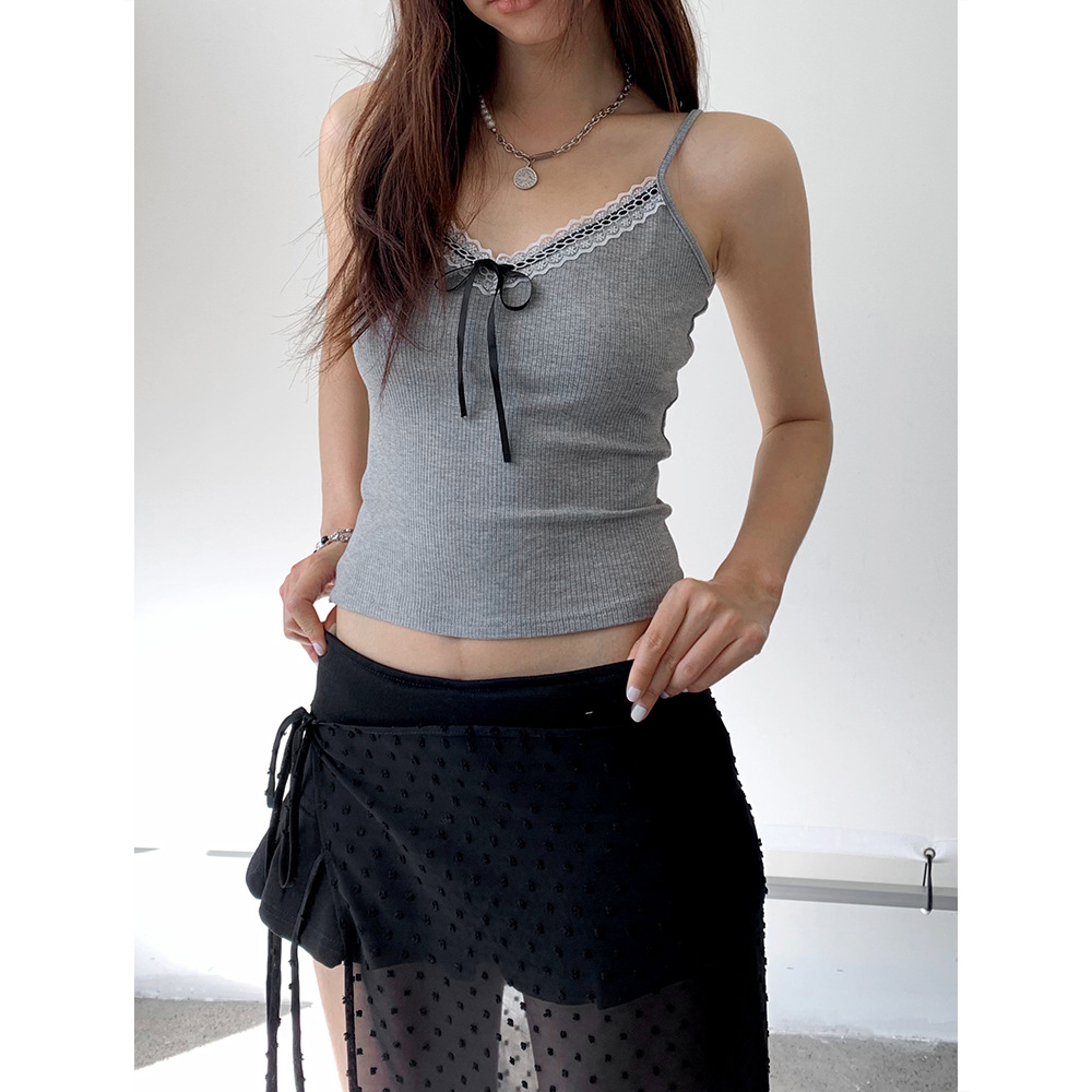 夏季纯欲蝴蝶结吊带背心蕾丝拼接V领纯色内搭上衣女