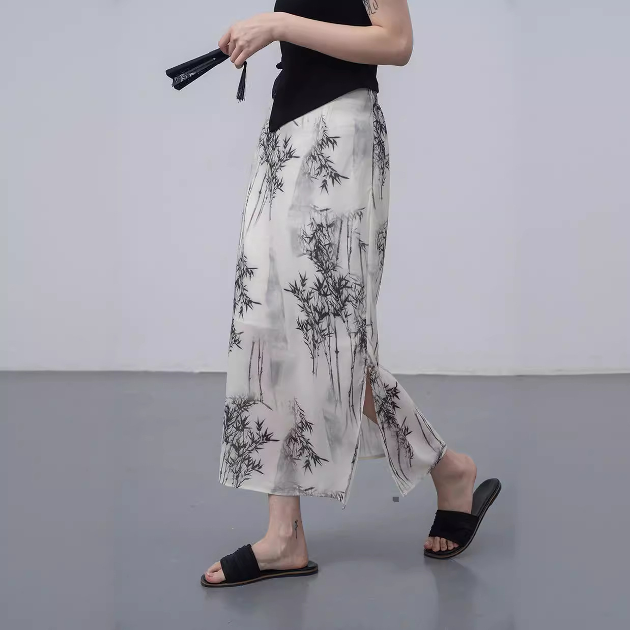 新中式半身裙女夏季设计感小众高腰半裙显瘦a字裙子开叉长裙
