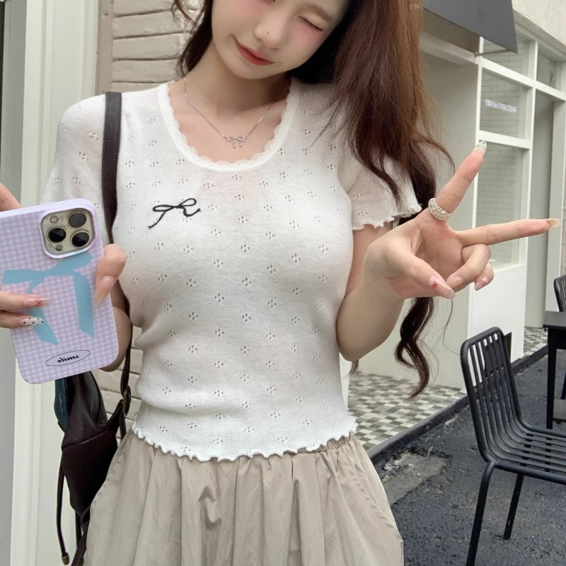 甜美风蝴蝶结青春T恤少女感重工钩花镂空修身短款针织衫上衣