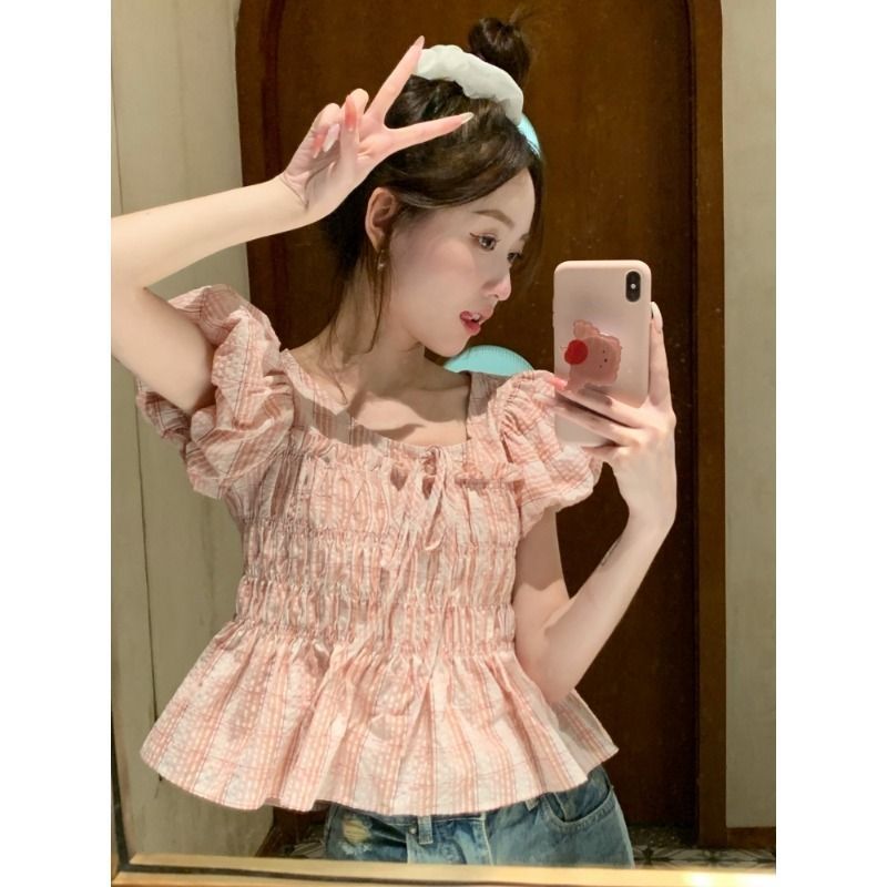 小众法式甜美上衣女夏泡泡袖木耳边粉色格子衬衫短袖独别致
