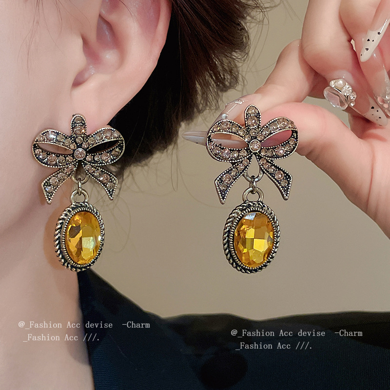 vintage中古银针镶钻蝴蝶结圆形耳环时尚轻奢复古耳坠宫廷风饰品