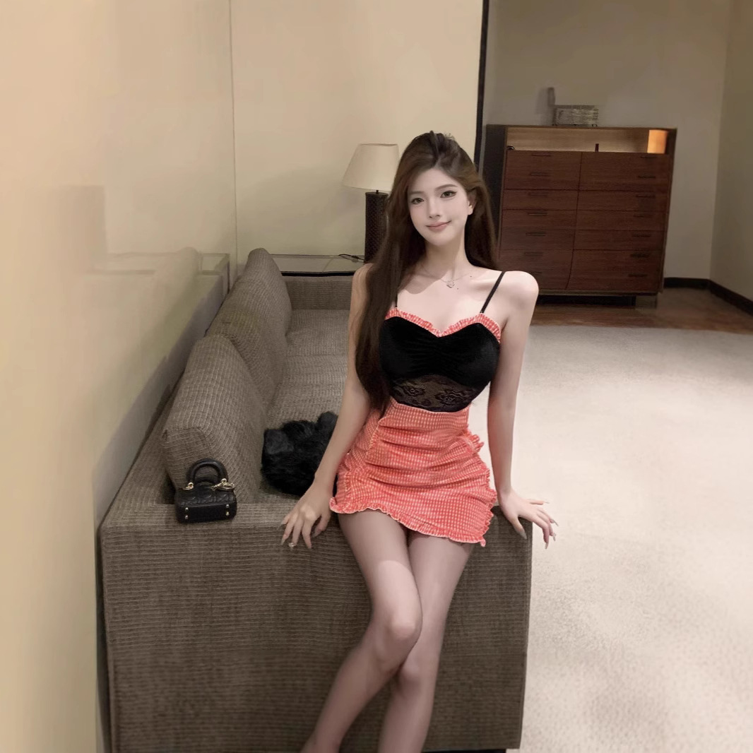 设计感气质性感蕾丝撞色辣妹丝绒紧身包臀吊带拼接主播褶皱连衣裙